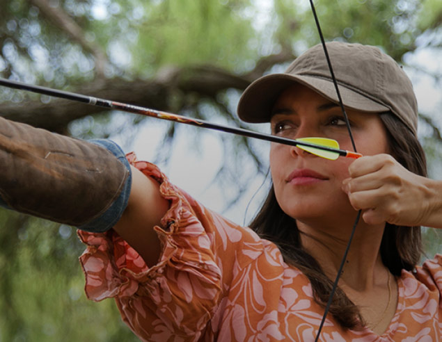 Mucho más que lanzar una flecha a un blanco. En el bosque frente al viñedo los pájaros acompañan el momento.